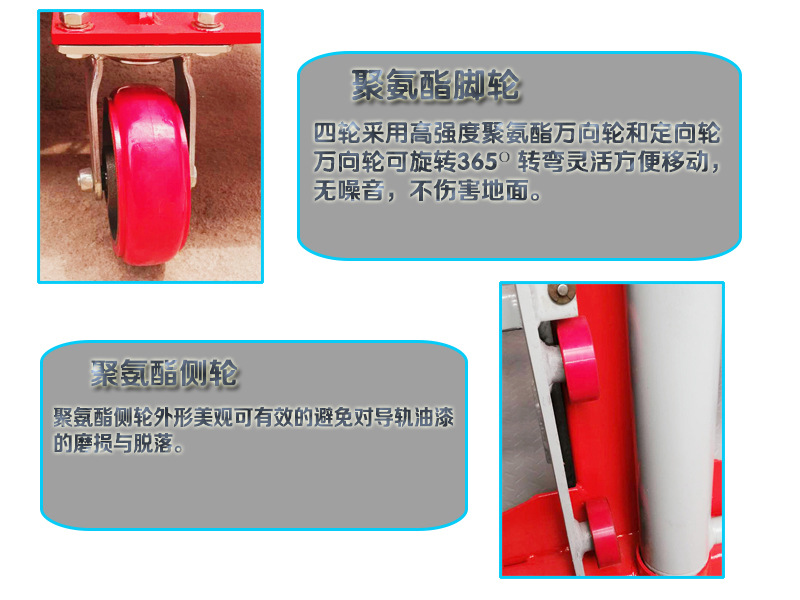 5.裝卸平臺在承重底梁架前面裝有兩個前腳輪,后面橫梁裝有兩個萬向輪便于整車移動;
