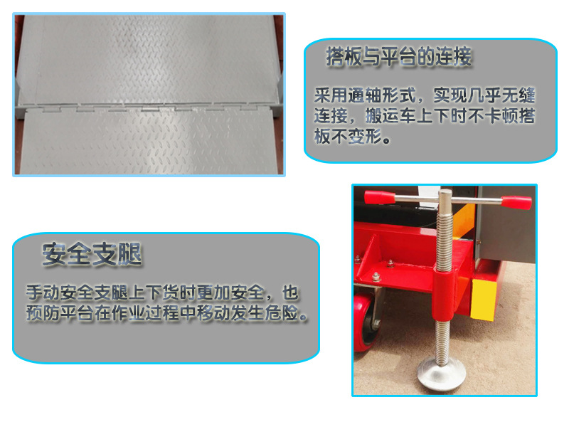 3.裝卸平臺機(jī)架后部設(shè)有可調(diào)節(jié)鏍絲桿支撐地面,用于裝卸貨作業(yè)時起到整體固定作用;